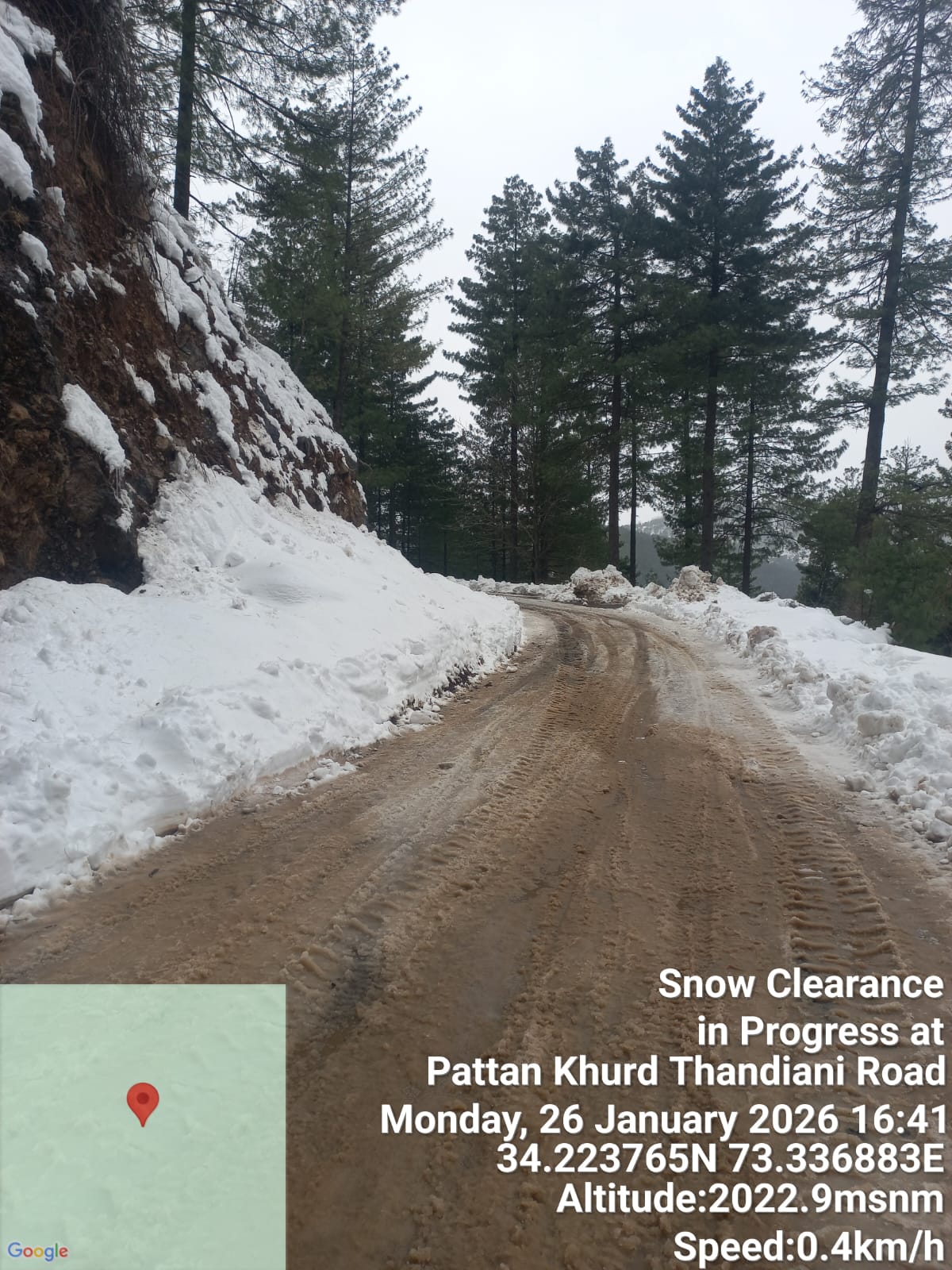 Fully restoredThis activity provides a detailed overview of the operational status of the Road Thandiani Pattan Khurd Road, recorded on 28 January, 2026. The affected site is situated within the Abbottabad district, operating under the administrative jurisdiction of XEN H/W ABBOTTABAD. The infrastructure has been primarily affected by Snow Clearance, encompassing a total span of 12 Kilometers.