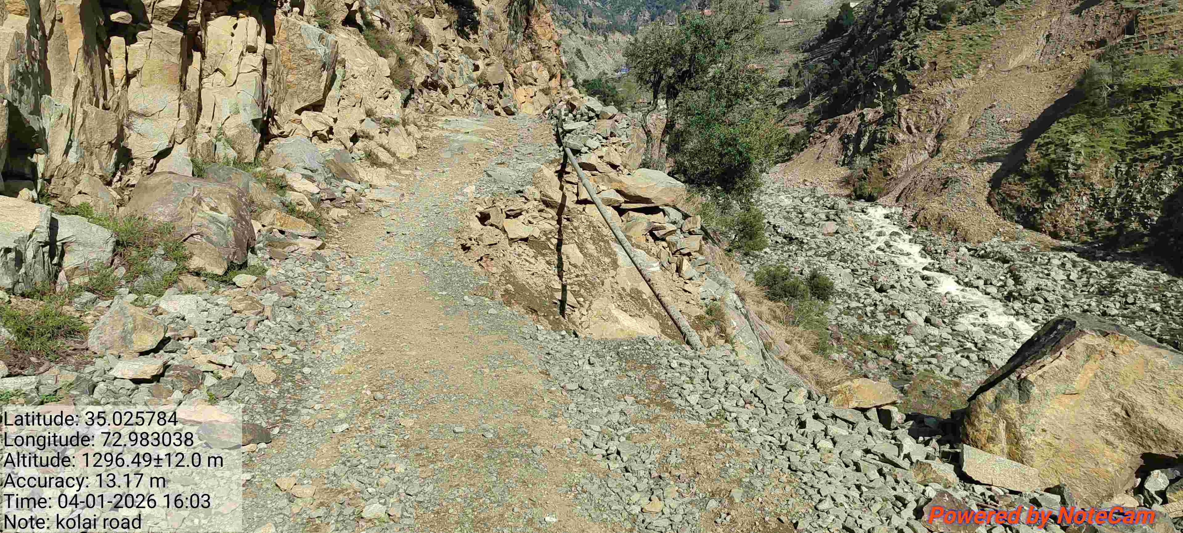 Partially restoredThis activity provides a detailed overview of the operational status of the Road Kollai Road, recorded on 30 March, 2026. The affected site is situated within the Kolai Pallas Kohistan district, operating under the administrative jurisdiction of XEN KOLAI PALLAS KOHISTAN. The infrastructure has been primarily affected by Retaining Wall, Shoulders, Land Sliding, encompassing a total span of 0.5 Kilometers.